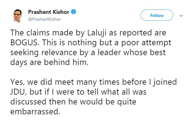 प्रशांत किशोर ने कहा, “लालू जी ने जो दावा किया है वह पूरी तरह से बकवास है। यह उस नेता द्वारा खुद को प्रांसगिक बनाने की कमजोर पहल है जिसके अच्छे दिन बीत चुके हैं।” किशोर ने माना की उन्होंने लालू यादव से मुलकात की थी। लेकिन, उनकी मुलाकात तब हुई थी जब वह जेडीयू में शामिल नहीं हुए थे। उन्होंने कहा, “हां, मेरे जेडीयू में शामिल होने से पहले हम (लालू और प्रशांत किशोर) कई दफा मिल चुके थे। लेकिन, इस दौरान क्या-क्या बातें हुईं अगर मैं मुंह खोल दूं तो उन्हें शर्मिंदा होना पड़ जाएगा ।”