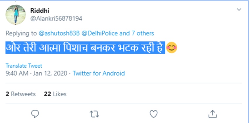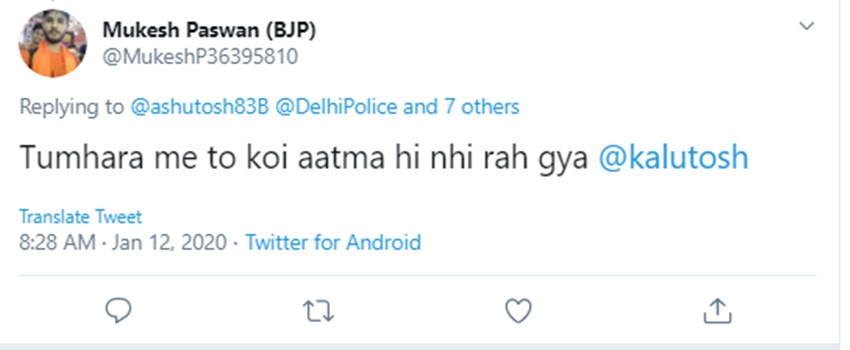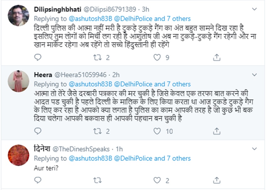 रिद्धि नाम की एक यूजर ने इसपर अपनी प्रतिक्रिया देते हुए लिखा कि ‘और तेरी आत्मा पिशाच बनकर भटक रही है’…मुकेश पासवान नाम के एक यूजर ने इसपर अपनी प्रतिक्रिया देते हुए लिखा कि ‘तुम्हारे में तो कोई आत्म ही नहीं रह गया।’ एक यूजर ने अपनी प्रतिक्रिया देते हुए लिखा कि ‘आशुतोष की कलम भी मर चुकी है। चाहें तो लिखकर देख लें।’ कुछ अन्य लोगों ने भी अपने ट्वीट के जरिए आशुतोष को ट्रोल करने की कोशिश की है।