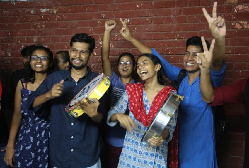 नतीजे जारी होने के बाद ढपली लेकर जीत का जश्न मनाते हुए नई छात्रसंघ अध्यक्ष आइशी घोष। (एक्सप्रेस फोटोः ताशी तोबग्याल)