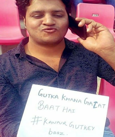 भारत और न्यूजीलैंड के बीच कानपुर के ग्रीन पार्क में खेले गए टेस्ट मैच के दौरान गुटखा चबाते हुए एक शख्स की तस्वीर काफी वायरल हुई थी। गुटखा चबाने का वीडियो वायरल होने के बाद शुक्रवार को कानपुर का वह युवक फिर से स्टेडियम पहुंचा। लेकिन इसबार उसके हाथ में एक पोस्टर था जिसमें लिखा हुआ था कि गुटखा खाना गलत बात है।