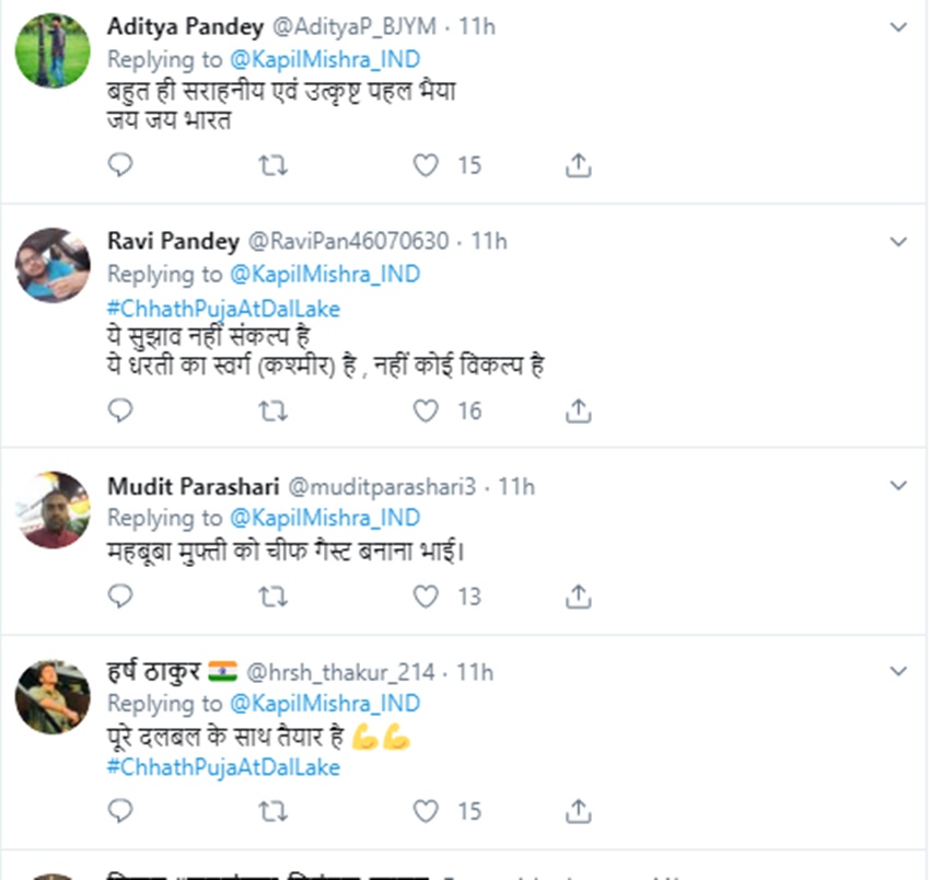 उन्होंने ट्वीट कर लिखा है, जिस दिन श्रीनगर की डल झील पर “छठ पूजा” शुरू हो गई, कश्मीर में कोई समस्या नहीं बचेगी#Article35A को हटाएं। डल झील में छठ मनाएं। आओ इस बार छठ पूजा डल झील में मनाएं। कपिल मिश्रा के इस ट्वीट पर लोगों ने अपनी प्रतिक्रिया जाहिर की है। एक यूजर ने लिखा है,रजिस्ट्रेशन हो गया है,डल झील के किनारे ठेकुआ खाने का आनंद ही अलग होगा।