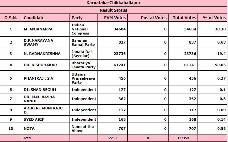 चिकबल्लापुरा विधानसभा सीट पर भाजपा की डॉक्टर के. सुधाकर ने जीत दर्ज की है। उन्होंने 34801 वोट से कांग्रेस के एम अंजनाप्पा ने हरा दिया।