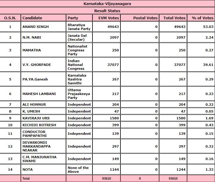 चुनाव आयोग ने विजयनगर विधानसभा सीट का परिणाम घोषित कर दिया है। इस सीट पर भाजपा के आनंद सिंह ने जीत दर्ज की है। सिंह ने 30125 वोटों से कांग्रेस के वीवाई घोरपड़े को हार दिया।
