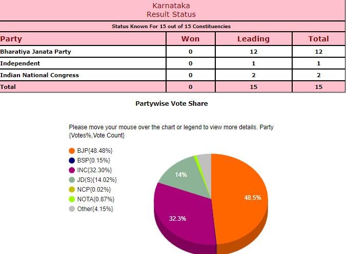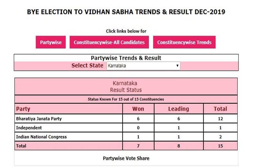 पूर्व के चुनाव में इन 15 सीटों में से 12 सीटें जीतने वाली कांग्रेस केवल दो निर्वाचन क्षेत्रों हुनासुरु और शिवाजीनगर में ही जीत हासिल कर पायी। पूर्व प्रधानमंत्री एच डी देवगौड़ा के नेतृत्व वाली जद(एस) ने विधानसभा चुनाव के दौरान इन 15 सीटों में तीन निर्वाचन क्षेत्रों- के आर पेटे, महालक्ष्मी लेआउट और होंसुर में जीत हासिल की थी। निर्वाचन अधिकारी ने बताया कि उपचुनाव में भाजपा ने 15 में से 12 सीटों पर, कांग्रेस ने दो और निर्दलीय ने एक सीट पर जीत दर्ज की।
