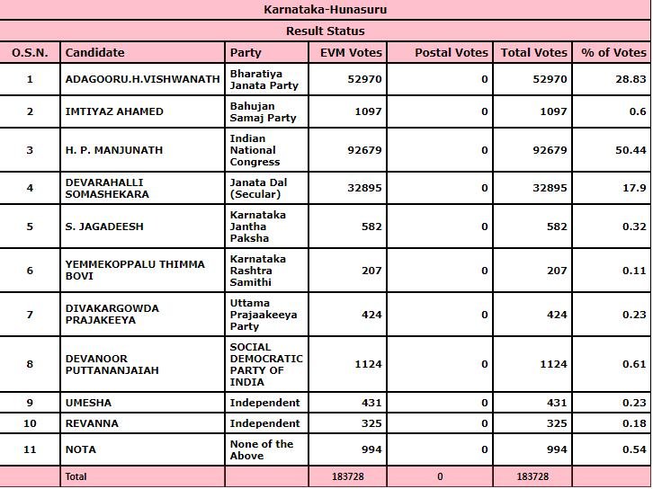 हुनसूर में कांग्रेस के एचपी मंजुनाथ ने बीजेपी के एच विश्वनाथ को 39727 वोटों से हराया।