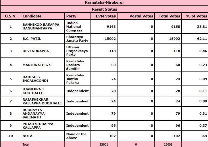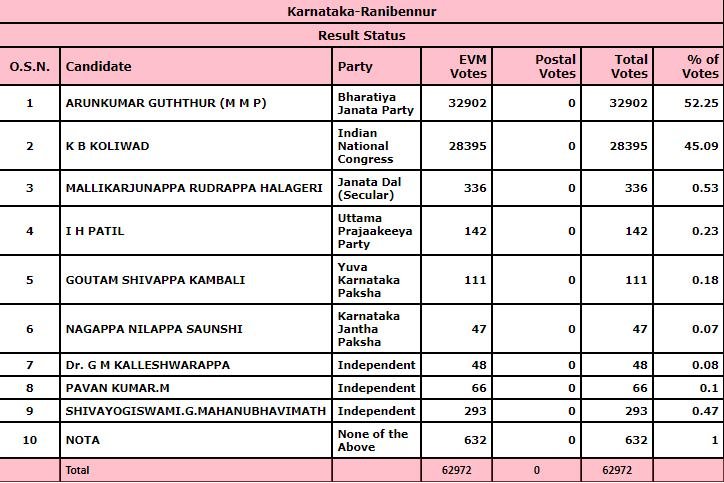 बीजेपी के अरुण कुमार ने रानीबेन्नूर सीट से कांग्रेस पत्याशी केबी कोलीवाड को 23222 वोटों से मात दी।