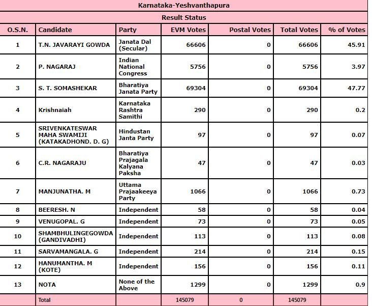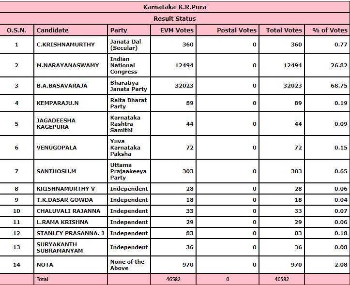 चुनाव आयोग के मुताबिक होसाकोटे में निर्दलीय उम्मीदवार शरत कुमार ने बीजेपी के एन नागराजू को 11486 वोटों से हराया।