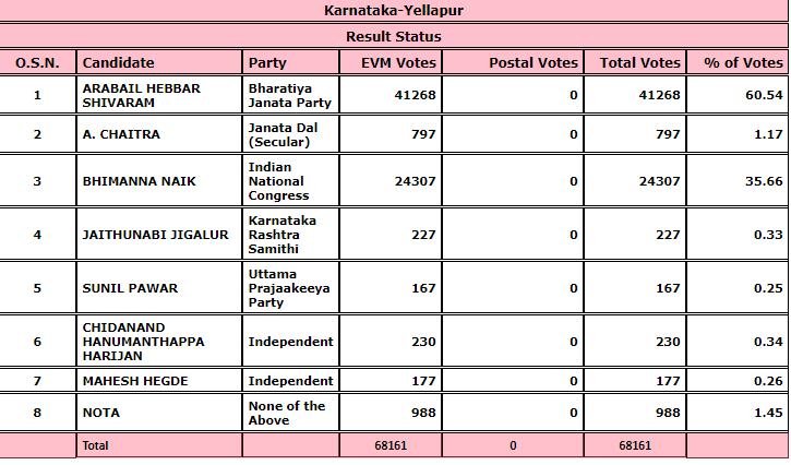चुनाव आयोग ने येल्लापुरा विधानसभा सीटे के परिणाम घोषित कर दिए हैं। यहां भाजपा के शिवराम ने जीत हासिल की है। उन्होंने विपक्षी कांग्रेस उम्मीदवार भीमन्ना नायिक को 31,408 वोटों से हरा दिया।
