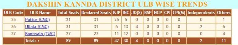 कर्नाटक के दक्षिण कन्नड़ जिले में सभी 89 सीटों के नतीजे आ चुके हैं। इस जिले में भाजपा को सबसे ज्यादा सीटें मिली हैं। यहां भाजपा 42, कांग्रेस 30 और जद(एस) 4 सीटों पर जीती है।