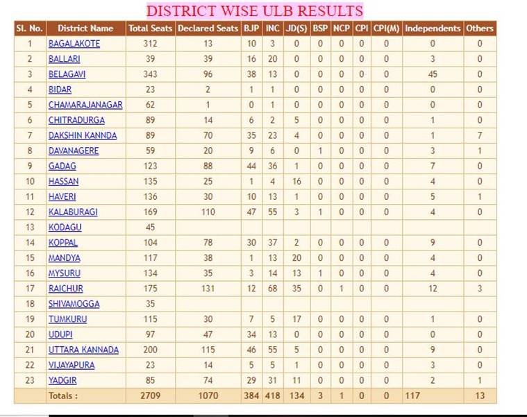 31 अगस्त को कुल 2664 अर्बन लोकल बॉडीज सीटों पर हुए चुनावों में से 1412 सीटों के नतीजे घोषित हो चुके हैं। कांग्रेस के हिस्से में अभी तक 560, भाजपा के हिस्से में 499 और जद(एस) के खाते में 178 सीटें आयी हैं। वहीं 150 सीटें स्वतंत्र उम्मीदवारों को मिली हैं।