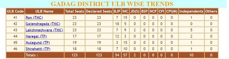 कर्नाटक के गादग जिले में भाजपा और कांग्रेस के बीच कांटे की टक्कर देखने को मिली। यहां कि 123 सीटों के नतीजे आ चुके हैं, जिनमें से 54 सीटें भाजपा और 57 सीटें कांग्रेस के खाते में गई हैं। जद(एस) को यहां सिर्फ 2 सीटों से संतोष करना पड़ा है। स्वतंत्र उम्मीदवारों को यहां 10 सीटों पर जीत मिली है।