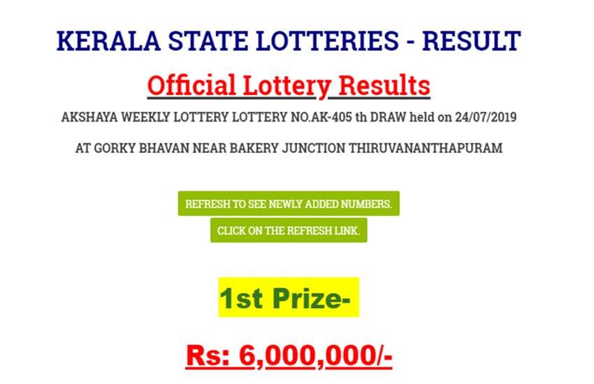 Kerala Akshaya Lottery AK-405 के रिजल्ट कुछ ही देर में घोषित होने वाले हैं। परिणाम घोषित होते ही बहुत सारे लोगों की किस्मत आज चमकने वाली है, क्योंकि लॉटरी का पहला इनाम 60 लाख रुपए और दूसरा इनाम 5 लाख रुपए है।