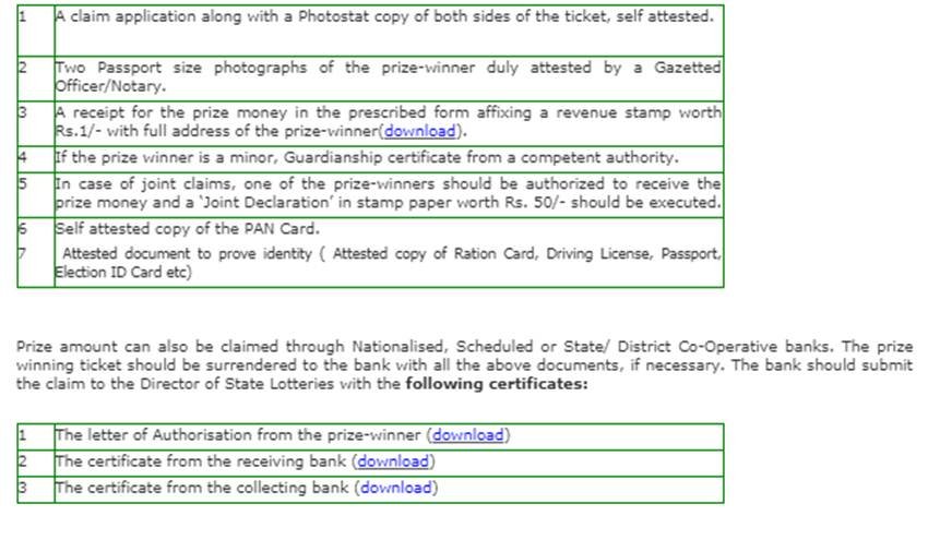 ईनाम की रकम किसी राष्ट्रीय, अनूसूचित या फिर राज्य/जिला कॉपरेटिव बैंक के जरिए भी क्लेम कराई जा सकती है। ईनाम जीतने वाले शख्स को इसके लिए टिकट सभी जरूरी दस्तावेजों के साथ सरेंडर करनी होगी। आगे बैंक उस क्लेम को स्टेट लॉटरी के निदेशक के पास कुछ कागजातों के साथ जमा करेगा।