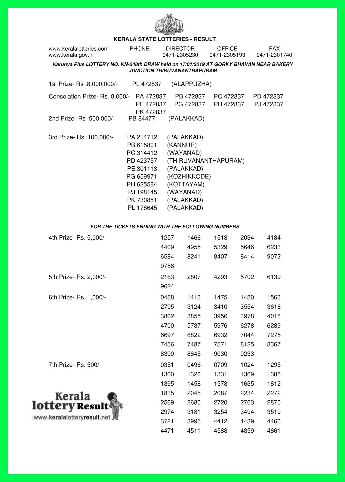 केरल करुण्या प्लस लॉटरी KN 248 के नतीजे गुरुवार (17 जनवरी, 2019) को जारी कर दिए गए। केरल लॉटरी विभाग की आधिकारिक वेबसाइट keralalotteryresult.net पर पूरी विनर्स लिस्ट उपलब्ध है। पहला ईनाम 80 लाख रुपए का था, जो कि PL 472837 टिकट धारक को दिया जाएगा। वहीं, दूसरा पुरस्कार पांच लाख था, जबकि तीसरे पुरस्कार के तौर पर एक लाख रुपए विजेताओं को दिए जाएंगे।