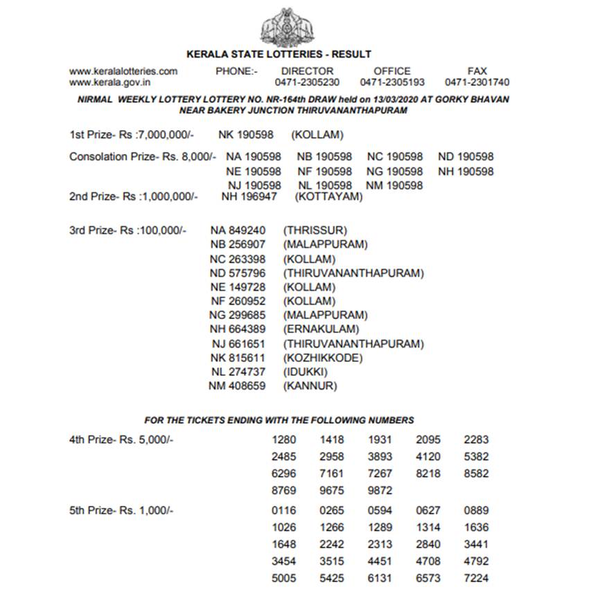 Kerala Nirmal NR-164 लॉटरी का 70 लाख रुपए का पहला इनाम NK-190598 टिकट नंबर का लगा है। वहीं दूसरे विजेता लॉटरी टिकट NH 196947 की 10,00,000 रुपये की लॉटरी लगी है।