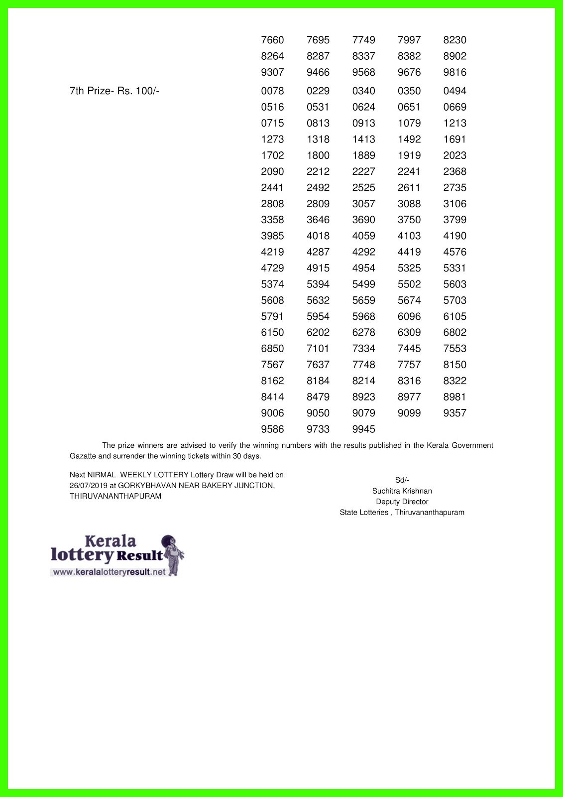 Kerala Nirmal Lottery Today Results: केरल स्टेट निर्मल लॉटरी एनआर-130 के नतीजे आ गए हैं। शुक्रवार (19 जुलाई, 2019) दोपहर तिरुवनंतपुरम स्थित गोरकी भवन में तीन बजे लकी ड्रॉ खुलना शुरू हुए, जबकि शाम चार बजे तक पूरा रिजल्ट जारी किया गया। नतीजे http://www.keralalotteryresult.net और http://www.keralalotteries.com पर चेक किए जा सकते हैं।