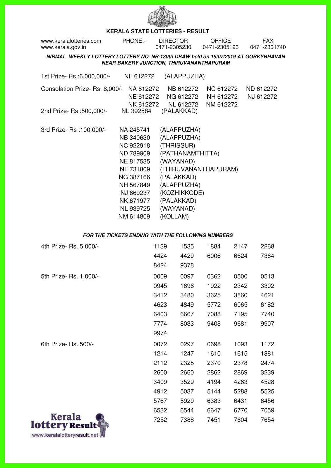केरल स्टेट निर्मल लॉटरी एनआर-130 में चौथा पुरस्कार 5,000 रुपए का रखा गया था, जो कि इन टिकट धारकों को दिया जाएगा- 1139 1535 1884 2147 2268 4424 4429 6006 6624 7364 8424 9378।