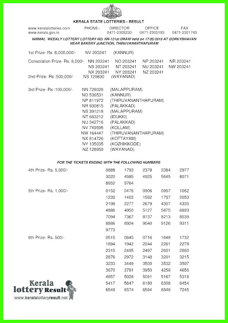 केरल निर्मल लॉटरी एनआर-121 के परिणामों की पहली सूची यहां देख सकते हैं।