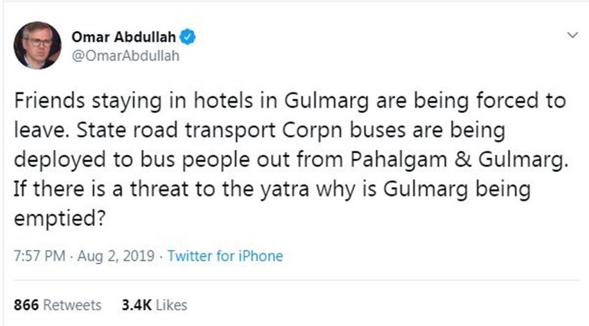 उमर ने अपने एक ट्वीट में लिखा है, “गुलमर्ग के होटलों में ठहरे दोस्तों को वहां से जाने के लिए मजबूर किया जा रहा है। राज्य सड़क परिवहन की बसों से पहलगाम और गुलमर्ग से लोगों को निकाला जा रहा है। अगर अमरनाथ यात्रियों पर खतरा है तो गुलमर्ग क्यों खाली कराया जा रहा है?” उन्होंने एक और ट्वीट किया है, इसमें उन्होंने कहा है “सेना और वायुसेना को अलर्ट पर क्यों रखा गया है? यह 35A और परिसीमन को लेकर तो नहीं। अगर ऐसा अलर्ट जारी किया गया है तो फिर यह बहुत कुछ अलग है।’’