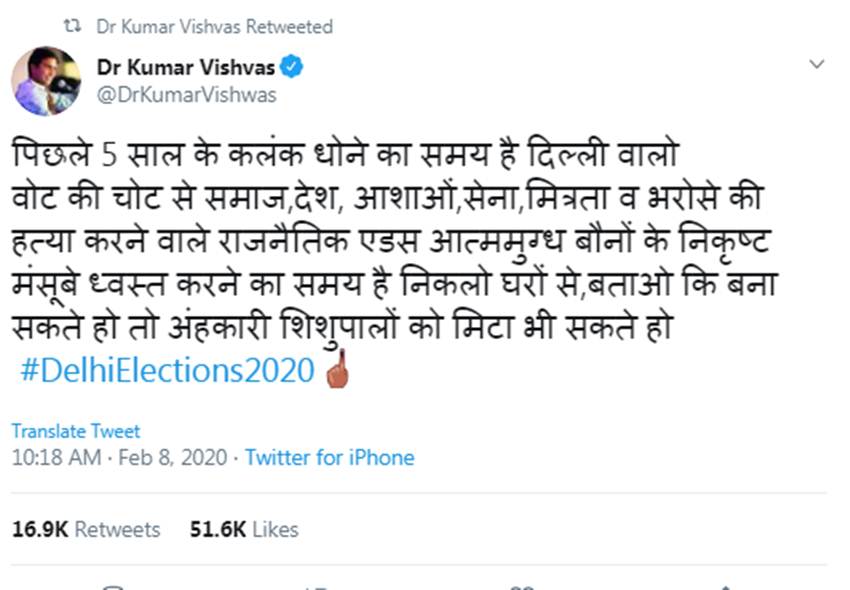 उन्होंने ट्वीट कर लिखा है, पिछले 5 साल के कलंक धोने का समय है दिल्ली वालों वोट की चोट से समाज, देश, आशाओं, सेना, मित्रता व भरोसे की हत्या करने वाले राजनीतिक एड्स आत्ममुग्ध बौनों के निकृष्ट मंसूबे ध्वस्त करने का समय है निकलो घरों से, बताओ कि बना सकते हो तो अंहकारी शिशुपालों को मिटा भी सकते हो।’