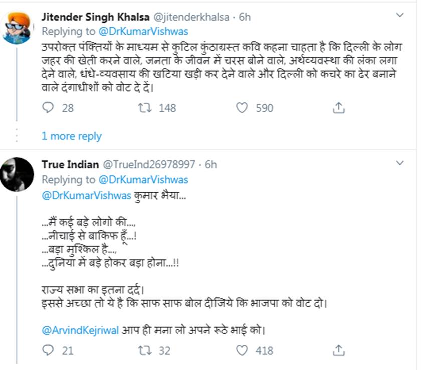 उनके इस ट्वीट पर लोगों ने उन्हें ट्रोल कर दिया। एक उपरोक्त पंक्तियों के माध्यम से कुटिल कुंठाग्रस्त कवि कहना चाहता है कि दिल्ली के लोग जहर की खेती करने वाले, जनता के जीवन में चरस बोने वाले, अर्थव्यवस्था की लंका लगा देने वाले, धंधे-व्यवसाय की खटिया खड़ी कर देने वाले और दिल्ली को कचरे का ढेर बनाने वाले दंगाधीशों को वोट दे दें।