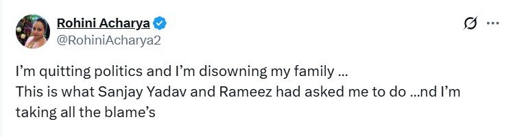 रोहिणी आचार्य ने सोशल मीडिया प्लेटफॉर्म X पर परिवार और राजनीति को छोड़ने का ऐलान किया। उन्होंने यह भी कहा कि संजय यादव और रमीज के उनसे ऐसा करने के लिए कहा था। रोहिणी ने कहा है कि वह सारा दोष अपने ऊपर ले रही हैं।