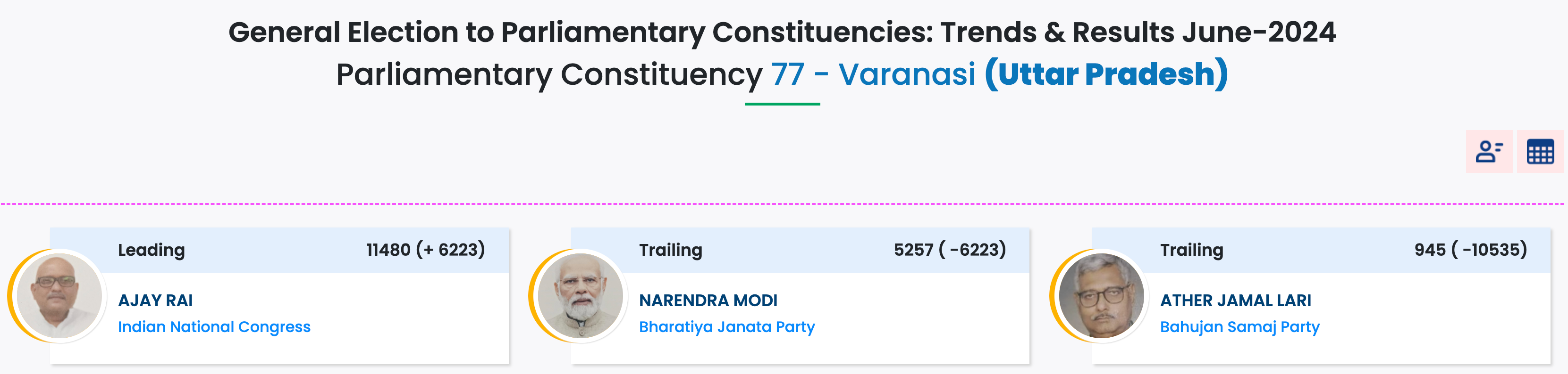 UP Lok Sabha Election Result 2024 LIVE: नरेंद्र मोदी छह हजार वोटों से पीछे चल रहे हैं। कांग्रेस के अजय राय आगे चल रहे हैं।