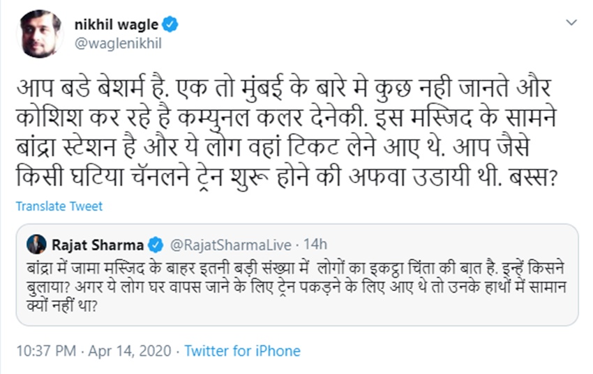 उनके इस ट्वीट पर पत्रकार निखिल वागले ने तीखी प्रतिक्रिया दी है। उन्होंने कहा, ‘आप बडे बेशर्म हैं। एक तो मुंबई के बारे मे कुछ नही जानते और कोशिश कर रहे हैं सांप्रदायिक रंग देने की। इस मस्जिद के सामने बांद्रा स्टेशन है और ये लोग वहां टिकट लेने आए थे। आप जैसे किसी घटिया चैनल ने ट्रेन शुरू होने की अफवा उडाई थी। बस?’