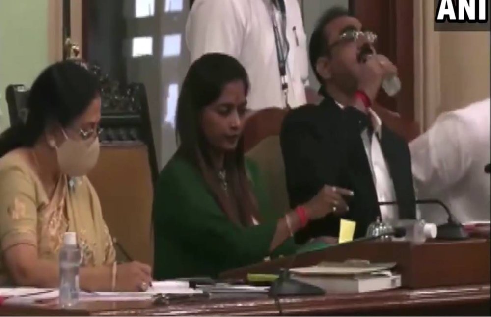 #WATCH: BMC Joint Municipal Commissioner Ramesh Pawar accidentally drinks from a bottle of hand sanitiser, instead of a bottle of water, during the presentation of Budget in Mumbai. pic.twitter.com/MuUfpu8wGT