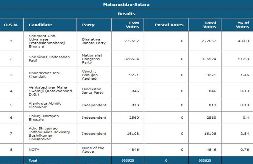 सतारा लोकसभा सीट पर दोनों ही नेताओं को पार्टी के ही पुराने नेताओं से चुनौती मिली। सतारा लोकसभा सीट उदयनराजे भोसले के बीजेपी में शामिल होने के बाद से खाली हो गई थी। पार्टी को उम्मीद थी कि भोसले के दम पर वह चुनाव नतीजे अपने पक्ष में कर लेगी लेकिन रुझानों में ऐसा होता नहीं दिखाई दे रहा।