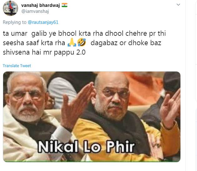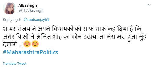 ट्विटर यूजर श्रीकांत ने ट्वीट कर लिखा, ‘शिवसेना का फ्यूचर डार्क मिस्ट्री है।’ अल्का सिंह ने लिखा, ‘शायर संजय ने अपने विधायकों को साफ-साफ कह दिया है कि अग किसी ने अमित शाह का फोन उठाया तो मेरा मरा हुआ मुंह देखोगे।’ वंशज लिखते हैं, ‘तमाम उम्र गालिब ये भूल करता रहा…धूल चेहरे पर थी पर शीशा साफ करता रहा। गजब और धोखेबाज है शिवसेना।’ पहाशाच नाम से ट्वीट कर लिखा, ‘राज की बात कह दूं तो जाने महफिल में क्या हो। राज खुलने का तुम पहले अंजाम सोच लो। इशारों को अगर समझो राज को राज ही रहने दो। समझा करो यार… भूल गए कि उनके पिता अभी मैदान में हैं।’ अल्का सिंह ने लिखा, ‘बाला साहेब जिसके खिलाफ लड़े आज उसी के साथ मिल गए।’