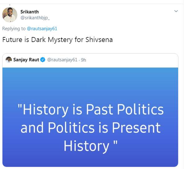 सुप्रीम कोर्ट ने सोमवार (25 नवंबर, 2019) को कहा कि वह महाराष्ट्र में देवेन्द्र फडणवीस को मुख्यमंत्री पद की शपथ दिलाने के राज्यपाल भगत सिंह कोश्यारी के फैसले के खिलाफ शिवसेना-एनसीपी-कांग्रेस की याचिका पर मंगलवार (26 नवंबर) को सुबह साढ़े दस बजे अपना फैसला सुनाएगा। खास बात है कि महाराष्ट्र सरकार मामले पर सुनवाई से पहले राज्य सभा सांसद और शिवसेना नेता संजय राउत ने एक ट्वीट किया, जो अब खूब वायरल हो रहा है। राउत ने कहा कि ‘इतिहास अतीत की राजनीति है और राजनीति वर्तमान इतिहास है।’ शिवेसना नेता के इस ट्वीट पर यूजर्स अब खूब प्रतिक्रिया दे रहे हैं।