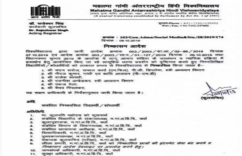 महाराष्ट्र के वर्धा स्थित महात्मा गांधी अंतरराष्ट्रीय हिंदी विश्वविद्यालय (MGAHV) के 6 छात्रों को बाहर का रास्ता दिखा दिया गया है। इन छात्रों ने देश में बढ़ती मॉब लिंचिंग की घटनाओं और रेप के आरोपी नेताओं को कथित तौर पर बचाए जाने समेत कुछ मुद्दों पर धरना दिया था और पीएम नरेंद्र मोदी को चिट्ठी लिखी थी।