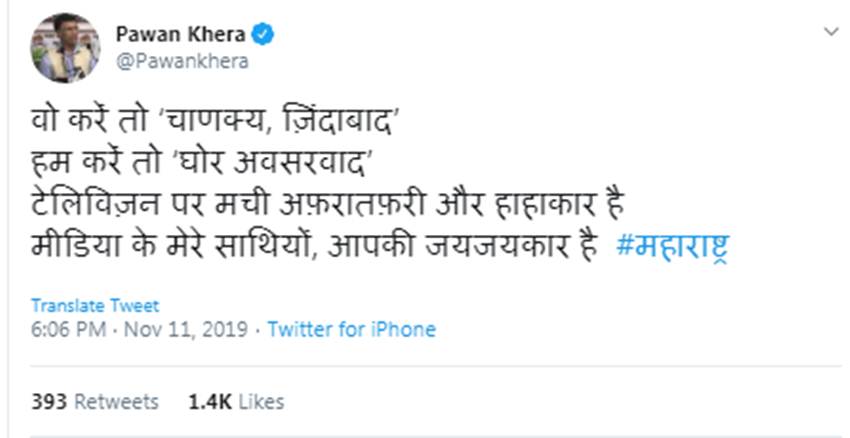 महाराष्‍ट्र में सरकार बनाने को लेकर सोमवार को हुए राजनीत‍िक घटनाक्रम का बचाव करते हुए कांग्रेस ने मीड‍िया पर न‍िशाना साधा है। पार्टी प्रवक्‍ता पवन खेड़ा ने एक ट्वीट के जर‍िए अम‍ित शाह पर न‍िशाना साधते हुए मीड‍िया पर ताना मारा। खेड़ा ने ट्वीट क‍िया- वो करें तो ‘चाणक्य, ज़िंदाबाद’ हम करें तो ‘घोर अवसरवाद’ टेलिविज़न पर मची अफ़रातफ़री और हाहाकार है मीडिया के मेरे साथियों, आपकी जयजयकार है।