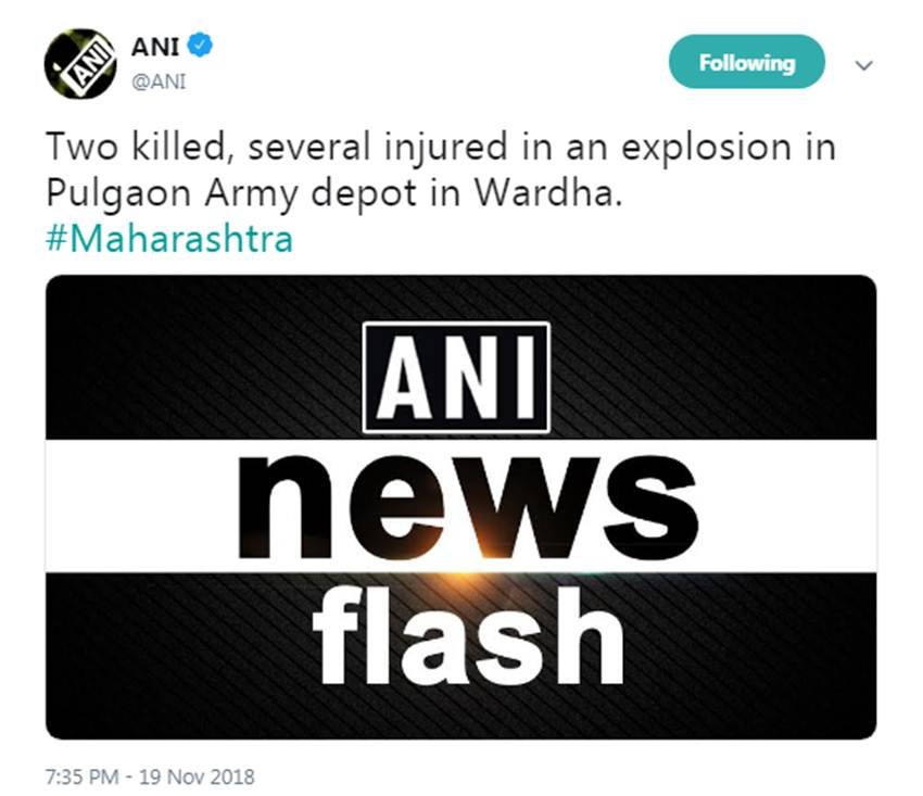 सेना डिपो में धमाके की घटना पर डिफेंस पीआरओ नागपुर बीबी पांडे ने कहा, "पुलगांव स्थित डिपो में जबलपुर के खमरिया ऑर्डनेंस फैक्ट्री के कर्मचारी पुराने विस्फोटकों को नष्ट कर रहे थे, तभी यह हादसा हो गया। हादसे में तीन मजदूरों व एक ऑर्डनेंस फैक्ट्री कर्मचारी की जान चली गई।"