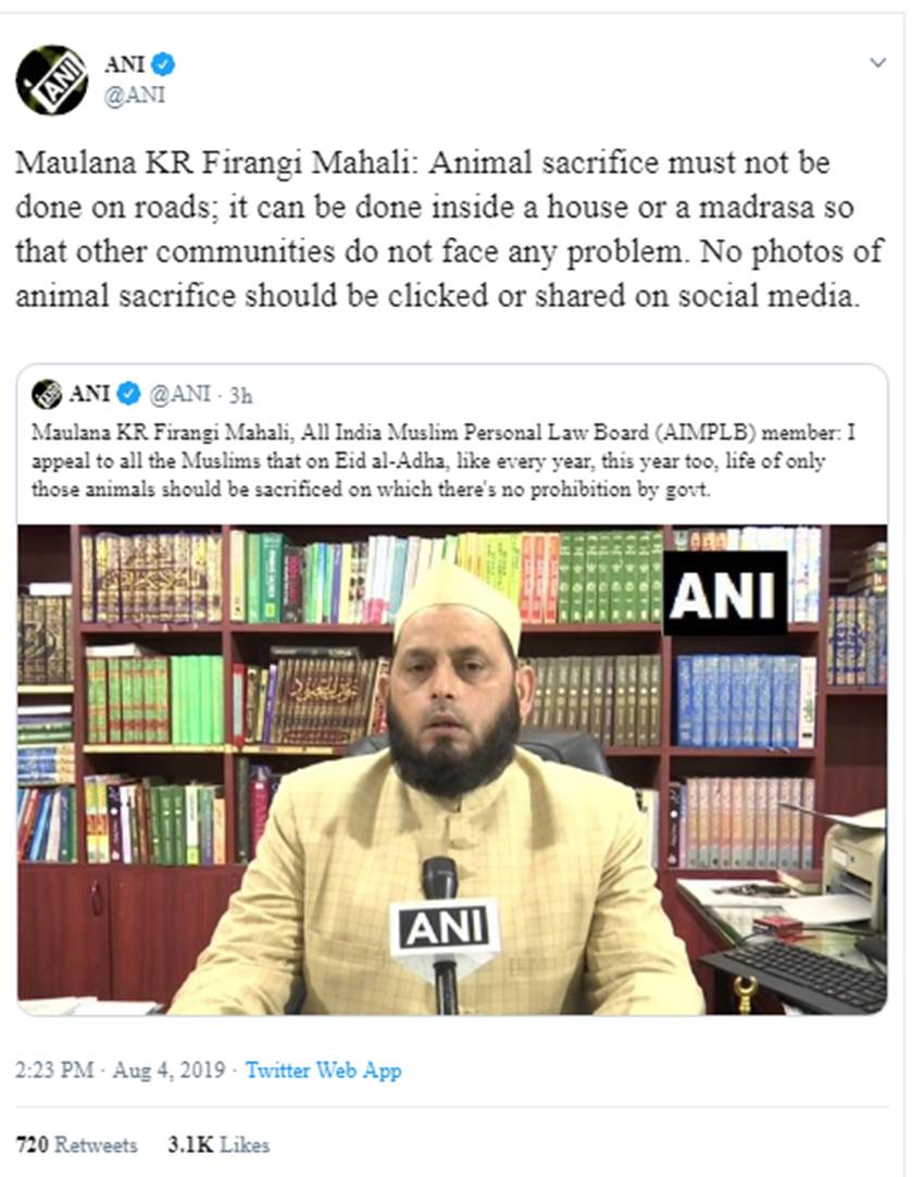 महली ने अपील की है कि कुर्बानी सिर्फ घरों और मदरसों में दी जाए ताकि दूसरे समुदाय के लोगों को दिक्कत ना हो। उन्होंने यह भी कहा कि इस दौरान कोई फोटो ना खींची जाए और सोशल मीडिया पर भी ऐसी तस्वीरें शेयर नहीं की जानी चाहिए।