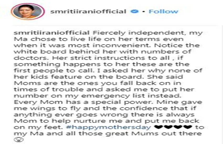 सोशल मीडिया साइट्स पर बेहद एक्टिव रहने वाली ईरानी ने एक फोटो शेयर करते हुए एख पोस्ट के जरिए बताया ‘मेरी मां ने अपने कमरे में एक व्हाइट बोर्ड लगाया हुआ है उसमें कुछ लोगों के नंबर लिखे हुए हैं। जब मैंने मां से पूछा कि आप अपने बच्चों के फोन नंबर अपनी लिस्ट में क्यों नहीं रखती हो। तो उन्होंने कहा कि अपने बच्चों के लिए मां हमेशा उनके लिए मौजूद रहती है। मां को जरूरत पड़ने पर हमेशा याद किया जा सकता है। मां ने सख्त निर्देश दिए हैं कि अगर उन्हें कुछ होता है या फिर कभी इमरजेंसी होती है तो इन्हीं नंबर पर सबसे पहले फोन कॉल किया जाए।’