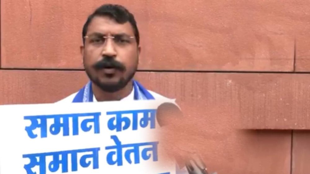 संसद में प्ले कार्ड लेकर प्रदर्शन कर रहे आजाद समाज पार्टी कांशीराम के मुखिया चंद्रशेखर ने कहा, ‘देश में सरकारी कर्मचारी की संख्या बहुत कम है। करीब 2 प्रतिशत सरकारी नौकरी है। लेकिन उसके अलावा भी एक बहुत बड़ा सेक्टर है जिसे हम प्राइवेट सेक्टर कहते हैं। जिसमें संविदा, ठेकेदारी और आउट सोर्सिंग के जरिए भी बहुत सारे कर्मचारी काम कर रहे हैं। उसी काम को करने के लिए सरकारी कर्मचारी को 8 घंटे का 50 हजार का वेतन मिलता है, जबकि उसी के साथ काम करने वाला संविदा वाले को कर्मचारी को 8 घंटे का 8 हजार मिलता है।’