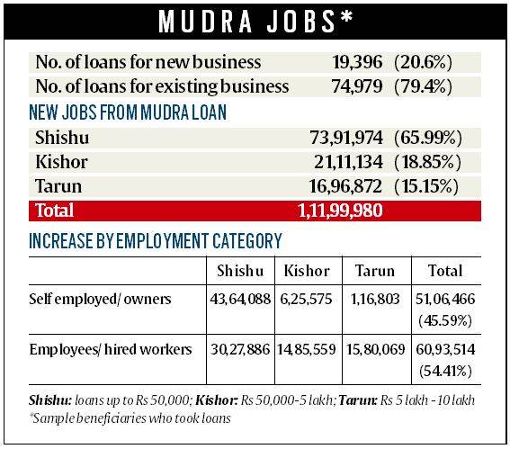 वहीं उत्पन्न हुई नौकरियों में से 66 प्रतिशत नई नौकरियां शिशु लोन से ही पैदा हुई हैं। वहीं किशोर लोन ने 18.85 प्रतिशत 18.85% लोगों को नौकरियां दी हैं। तरुण लोन से 15.51% लोगों को रोजगार मिला है।