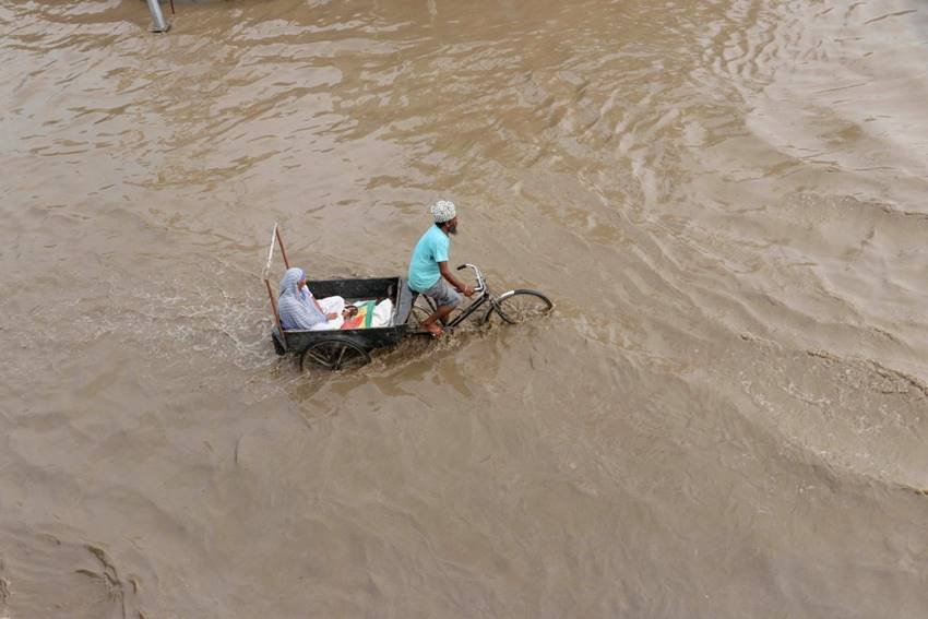 पंजाबः पटिया में सड़कें जलमग्न नजर आईं। सोमवार को पानी के बीच बुजुर्ग महिला को लेकर जाता रिक्शा चालक। (फोटोः पीटीआई)
