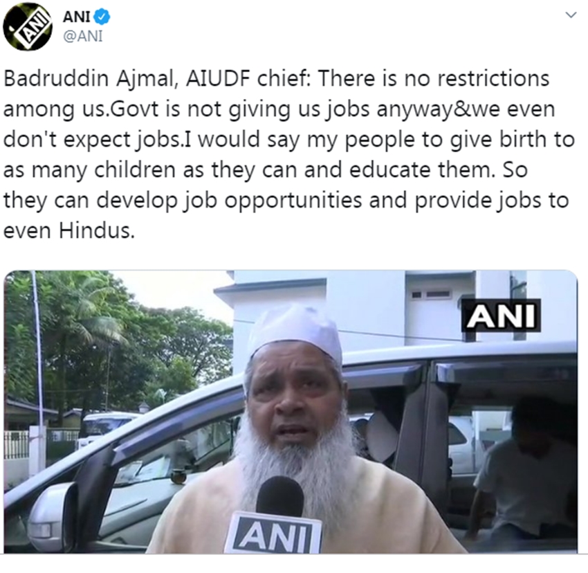अजमल ने कहा कि ये लोग नया कानून ला रहे हैं ताकि मुस्लिमों को सरकारी नौकरी से दूर रख सकें। अगर उन्हें (मुस्लिमों) नौकरी नहीं मिलेगी तो पांच-छह बच्चे तो पैदा करेंगे ताकि आमदनी के लिए उनके पास ज्यादा सहारा हो। मुस्लिम कौम में भी लोग पढ़े लिखे होते हैं और लोग आगे बढ़ रहे हैं और दुनिया भर में काम कर रहे हैं।