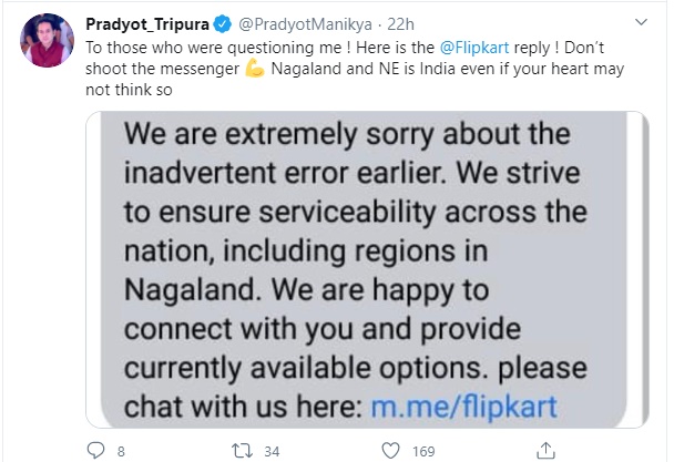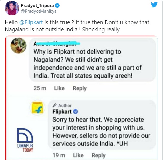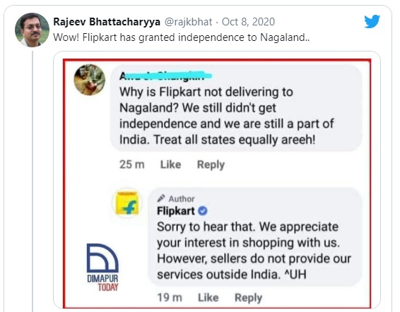 ई-रिटेल वेबसाइट फ्लिपकार्ट के सोशल मीडिया हैंडल को हैंडल करने वाले एक कर्मचारी द्वारा नागालैंड को उसने भारत के बाहर बता दिया। एक ग्राहक को ऐसा बताए जाने के बाद नाराजगी जताई गई, क्योंकि स्थान “भारत के बाहर” नहीं था। जैसा कि ई-कॉमर्स कंपनी ने अपनी बिग बिलियन बिक्री का विज्ञापन दिया था, कोहिमा के एक ग्राहक ने फेसबुक पर पूछा कि वेबसाइट अब राज्य में आइटम क्यों नहीं दे रही है। “हमें अभी भी स्वतंत्रता नहीं मिली है और हम अभी भी भारत का हिस्सा हैं। सभी राज्यों के साथ समान रूप से व्यवहार करें!, ”यूजर ने अपने कमेंट में कहा।