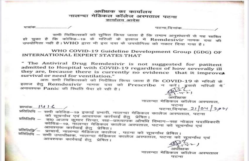 कोरोना महामारी की दूसरी लहर के बीच मरीज और परिजन रेमडेसिविर जैसी दवाइयों के लिए इधर-उधर भटकते और मदद की गुहार लगाते दिख रहे हैं। रेमडेसिविर की किल्लत साफ दिख रही है। कालाबाजारी तक हो रही है। इन सबके बीच बिहार के नालंदा मेडिकल कॉलेज पटना ने एक पत्र जारी करके कहा है कि कोविड के इलाज में इस दवा की उपयोगिता नहीं है। who ने भी इसे नकार दिया है। खास बात है कि बाजार में ये दवा नहीं मिल रही है।
