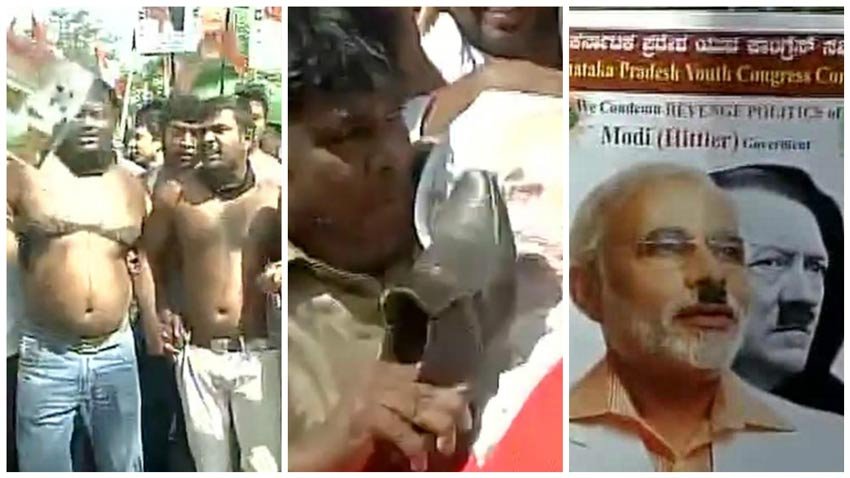 शर्ट उतारकर प्रदर्शन, पोस्टर में मोदी को हिटलर दिखाया