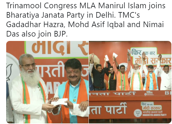 ममता बनर्जी की पार्टी तृणमूल कांग्रेस के विधायक मनीरुल इस्लाम ने दिल्ली में भारतीय जनता पार्टी में शामिल हो गए हैं। इसके अलावा तृणमूल कांग्रेस के गदाधर हाजरा, मोहम्मद आसिफ इकबाल और निमाई दास भी बीजेपी में शामिल हुए हैं। इसके एक दिन पहले ही 50 से अधिक पार्षद और दो विधायक पार्टी छोड़ चुके हैं।