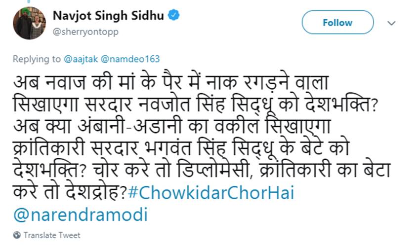 कांग्रेस नेता और पंजाब सरकार में मंत्री नवजोत सिंह सिद्धू ने प्रधानमंत्री नरेंद्र मोदी पर तीखा हमला बोला है। नवजोत सिंह सिद्धू ने अपने एक ट्वीट में लिखा है कि अब नवाज की मां के पैर में नाक रगड़ने वाला सिखाएगा सरदार नवजोत सिंह सिद्धू को देशभक्ति? अब क्या अंबानी-अडानी का वकील सिखाएगा क्रांतिकारी सरदार भगवंत सिंह सिद्धू के बेटे को देशभक्ति? चोर करें तो डिप्लोमेसी, क्रांतिकारी का बेटा करे तो देशद्रोह? अपने इस ट्वीट के साथ नवजोत सिंह सिद्धू ने #chowkidarChorHai का टैग भी इस्तेमाल किया। अपने इस ट्वीट के साथ नवजोत सिंह सिद्धू ने पीएम मोदी की पाकिस्तान यात्रा का एक वीडियो भी शेयर किया है, जिसमें वह पाकिस्तान के पूर्व प्रधानमंत्री नवाज शरीफ के साथ दिखाई दे रहे हैं। बता दें कि नवाज शरीफ के जन्मदिन पर पीएम मोदी अचानक पाकिस्तान पहुंच गए थे और इस दौरान उन्होंने नवाज शरीफ की मां से भी मुलाकात की थी। नवजोत सिंह सिद्धू ने इसी बात को लेकर पीएम मोदी पर निशाना साधा है।