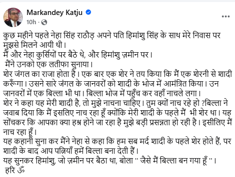 मार्कंडेय काटजू ने अपने फेसबुक पोस्ट में लिखा, “कुछ महीने पहले नेहा सिंह राठौर अपने पति हिमांशु सिंह के साथ मेरे निवास पर मुझसे मिलने आयी थी। मैं और नेहा कुर्सियों पर बैठे थे, और हिमांशु ज़मीन पर।मैंने उनको एक लतीफा सुनाया।”