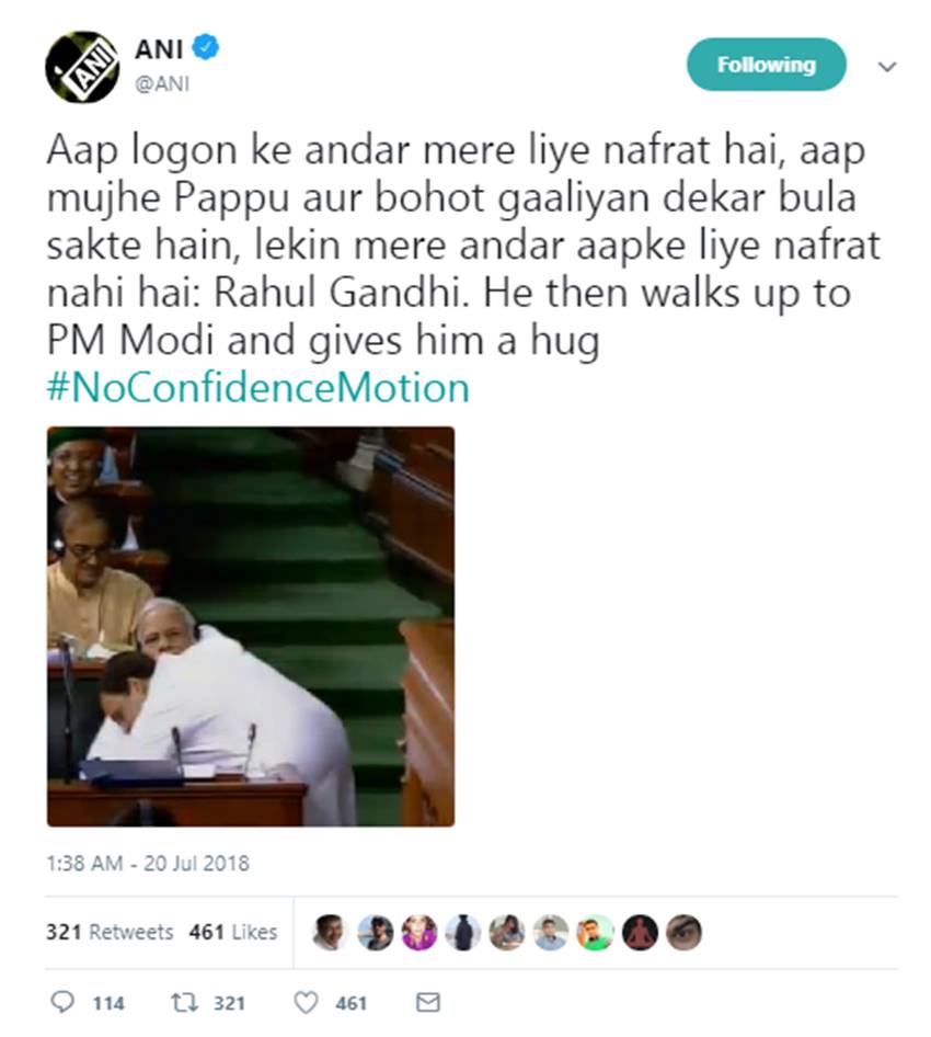 अविश्वास प्रस्ताव पर चर्चा के दौरान शुक्रवार (20 जुलाई) को कांग्रेस अध्यक्ष राहुल गांधी का अलग अंदाज देखने को मिला। अपने भाषण में मोदी सरकार पर हमला बोलने के दौरान उन्होंने कहा, “आपके लिए मैं पप्पू हूं। लेकिन मेरे दिल में आपके लिए नफरत नहीं है।” वह इसके बाद पीएम के पास गए और उनके गले लग गए, जिस पर मोदी एक पल को असहज हो गए थे। बाद में उन्होंने राहुल को पास बुलाया और हाथ मिलाकर उन्हें भेजा।