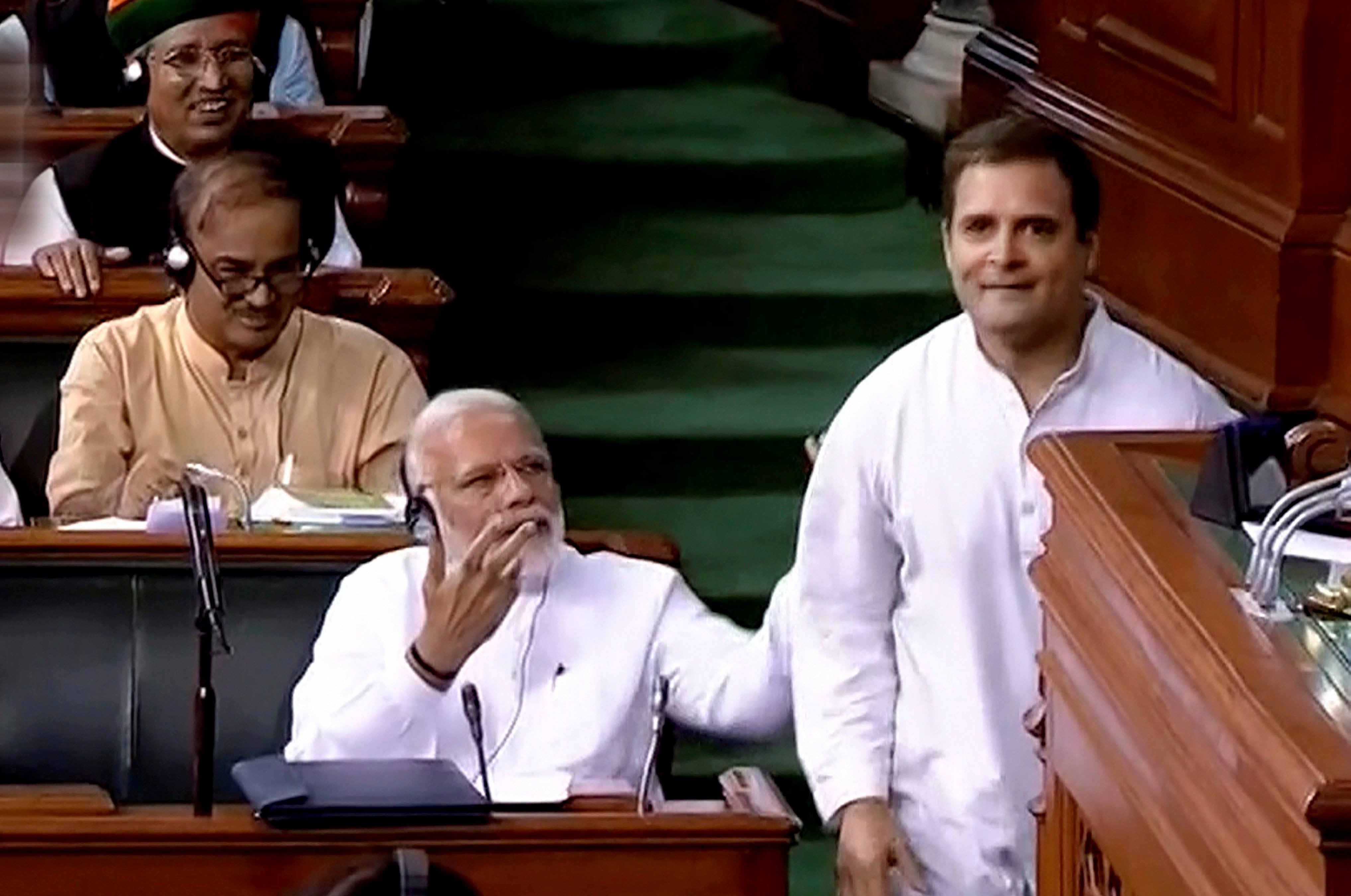 कांग्रेस अध्यक्ष राहुल गांधी अविश्वास प्रस्ताव पर बहस के दौरान पीएम नरेंद्र मोदी पर हमलावर रहे। उन्होंने कहा कि प्रधानमंत्री और उनकेे अध्यक्ष (बीजेपी अध्यक्ष अमित शाह) सत्ता के बिना नहीं रह सकते, क्योंकि वे भयभीत हैं। यहां तक कि उन्होंने यह भी कहा कि आप भले ही मुझे 'पप्पू' समझें। इस बीच, उन्होंने अप्रत्याशित कदम उठाते हुए अपने स्थान से उठ कर पीएम मोदी से गले भी मिले। इस दौरान राहुल की मां और यूपीए की अध्यक्ष सोनिया गांधी मुस्कुराते हुए मेज थपथपाती दिखीं।