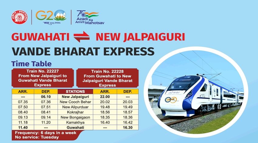 गुवाहाटी-न्यू जलपाईगुड़ी वंदे भारत मंगलवार को छोड़कर सप्ताह में 6 दिन चलेगी। यह कामाख्या, न्यू बोंगईगांव, कोकराझार, न्यू अलीपुरद्वार और न्यू कूचविहार स्टेशनों पर ठहरेगी।